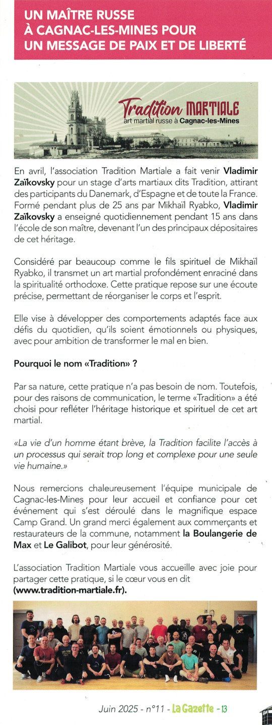 Depuis quelques années, Vladimir Zaïkovsky, vient faire une tournée de stages en Europe de l'ouest au printemps et en automne. Il est venu deux fois à Cagnac-les-Mines en 2025 mais pour des raisons logistiques ne pourra pas revenir chez nous au printemps.